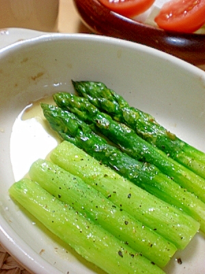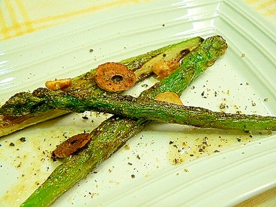 シンプルな焼きアスパラガスは ニンニクオイルと黒胡椒が決め手